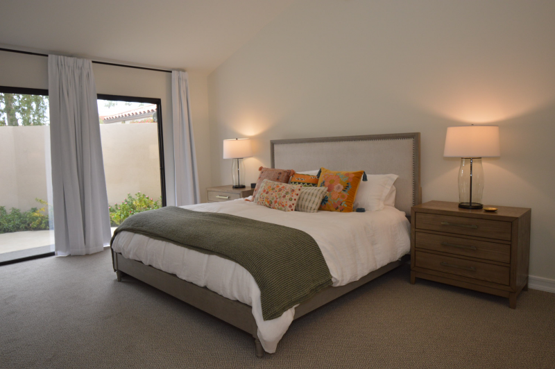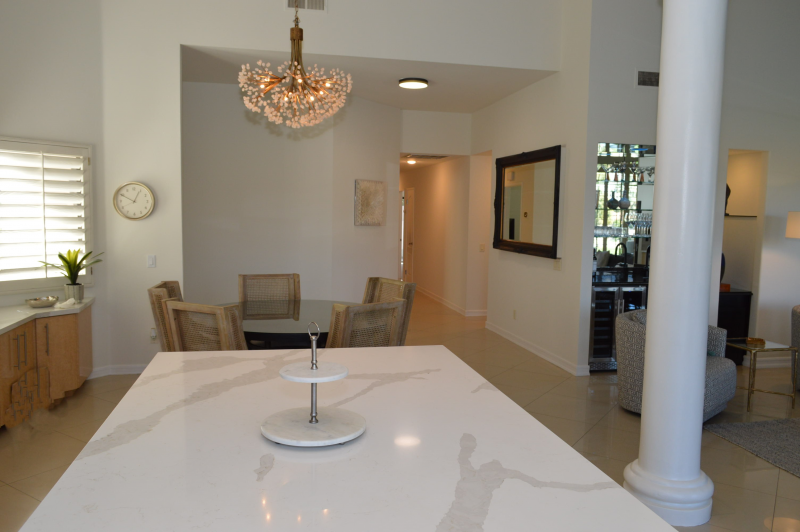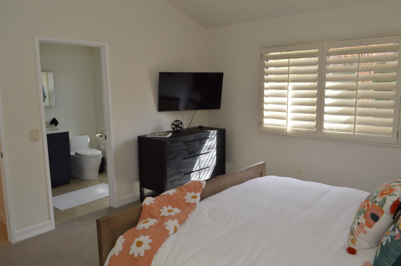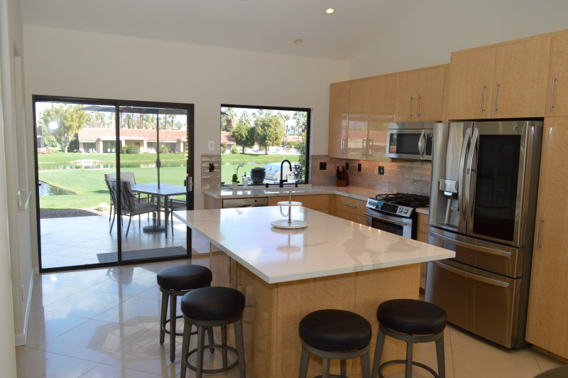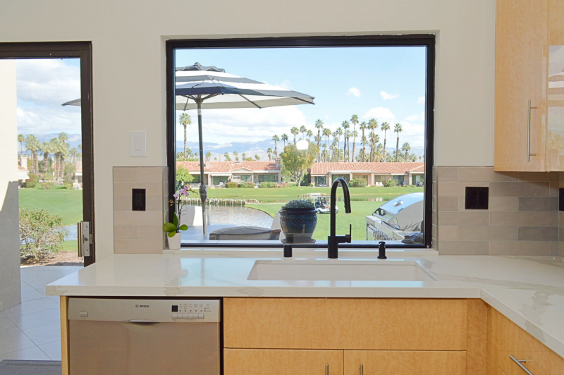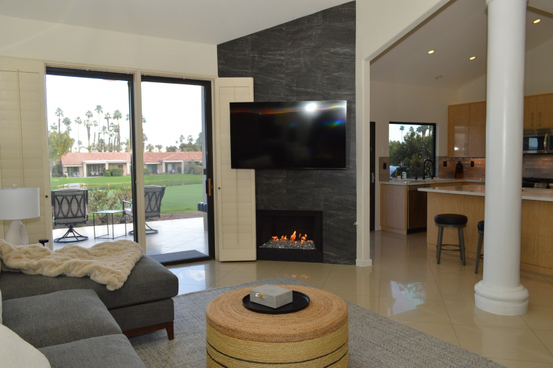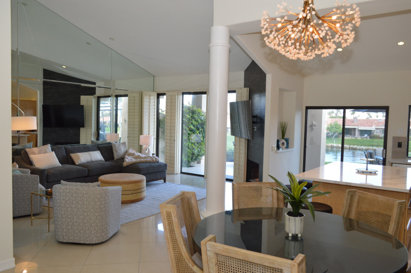 This Sycamore floor-planned home of approximately 2,000 square feet has an updated design of contemporary finishes featured in the flooring, surfaces, appliances, and fixtures. Bonuses include a tiled, floor-to-ceiling fireplace in the main living area and a generous use of glass with a slider to the patio of incredible lake and mountain views. Access to the kitchen is via a second slider where the kitchen is equipped with stainless appliances (gas stove) and an over-sized island for dining and prep that is adjacent to a separate dining space. More bonuses include two ensuite bedrooms with king beds--one with a private courtyard, a guest bathroom and bedroom with two double beds, Smart TVs in every room, a separate laundry room, and a garage attached to the front courtyard that houses a golf cart that is available for use. No Pets or children under 6 years old. The City of Palm Desert Permit #STR2024-0126. PMI Coachella Valley #1992806
