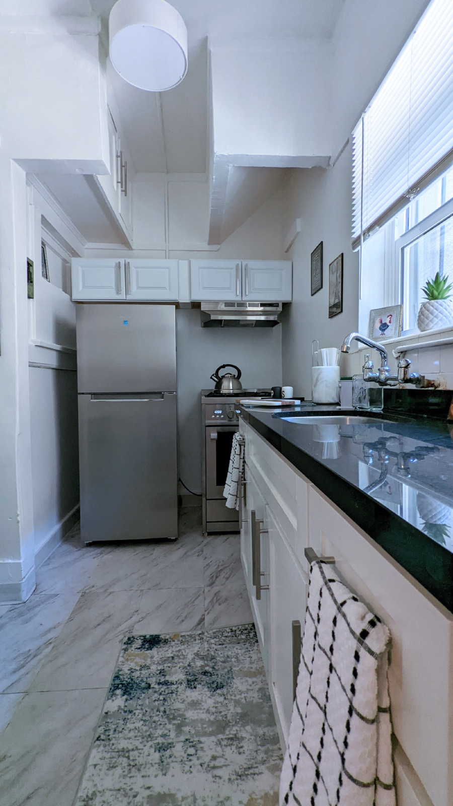 Inside, you'll find modern updates tastefully blended with classic charm. The kitchen features sleek quartz countertops, brand-new cabinets, a new stove, and refrigerator, along with a cozy dining nook perfect for relaxed meals. Set in a well-maintained historic building with professional management, this private studio ensures a quiet, comfortable stay.