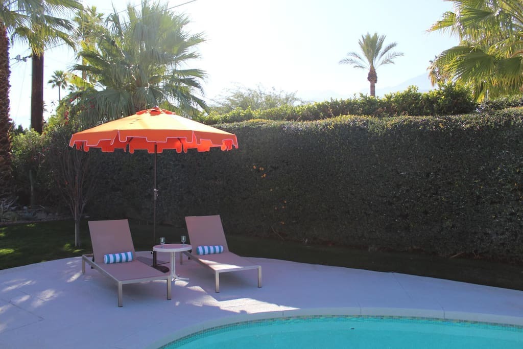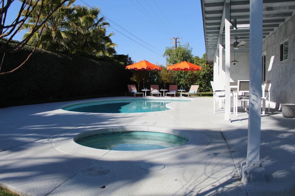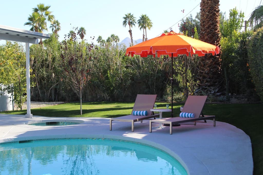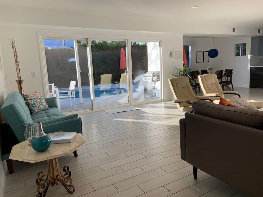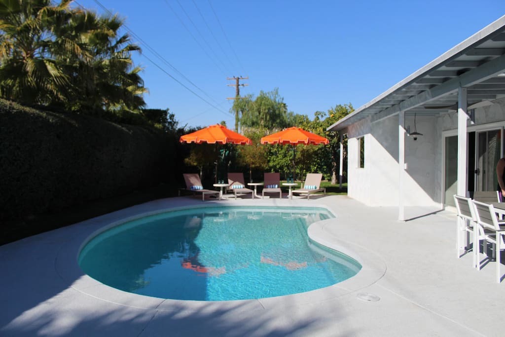 This recently renovated end to end home features porcelain floors throughout, quartz countertops, skylights, LED lighting, rainfall showers, and heated pool and jacuzzi with Pebble-Tec and Kool Deck. Upscale Mid-Century touches everywhere.