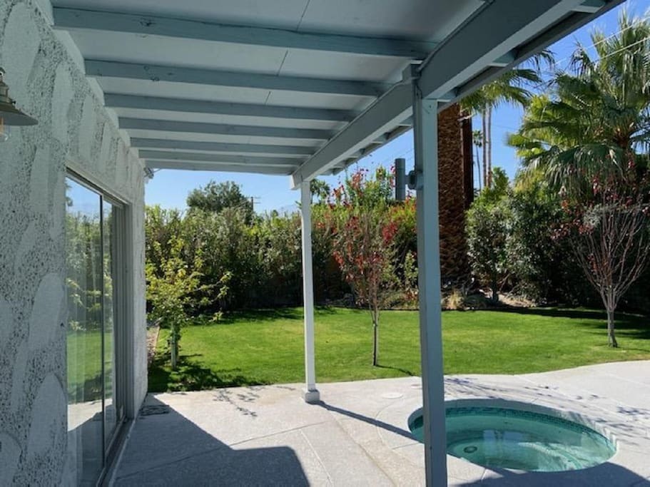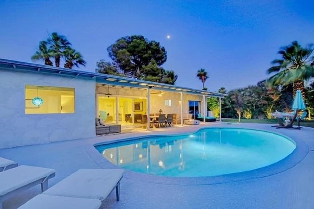 Outdoor entertaining areas, dining and living room, kitchen, and master suite in this beautifully modernized mid-century ranch. This gated property just around 3 minutes away from Downtown Palm Springs is surrounded by tall, mature and lush trees with grassy front and backyards providing a unique and very private oasis in the desert.